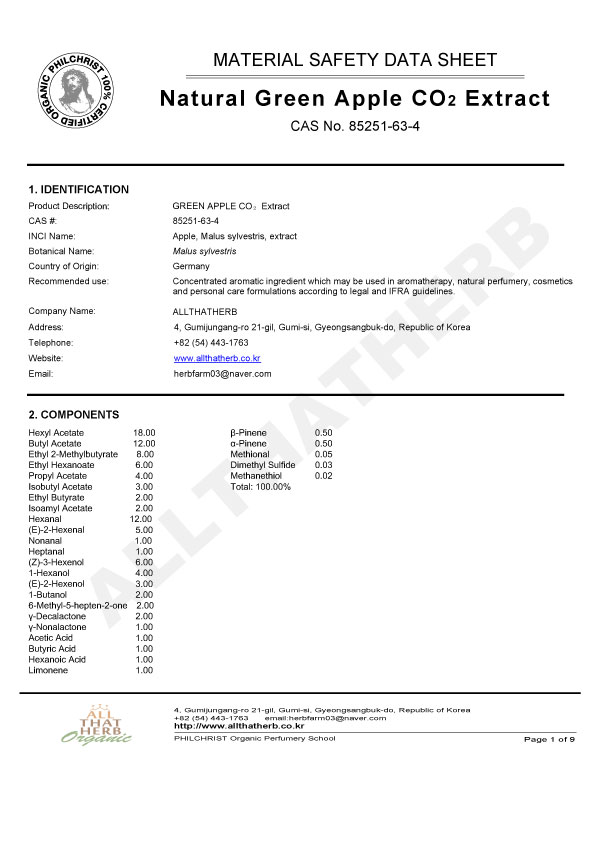 Botanical Name: Malus sylvestris Note: Top-Middle Note Part of the Plant: Fruit (Peel & Flesh) Country of Origin: Germany Extraction Method: Supercritical CO©ü Extracted Aromas: Fresh, green, fruity, slightly tart with natural apple esters