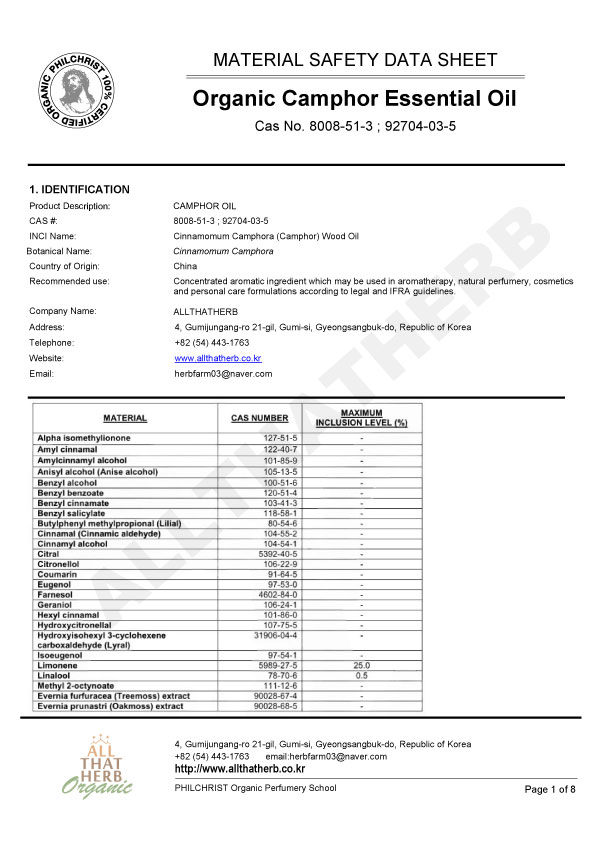 Botanical Name: Cinnamomum camphora Note: Middle to Base Note Part of the Plant: Wood Country of Origin: China Extraction Method: Steam Distilled Aromas: Sharp, penetrating, camphoraceous, and medicinal scent