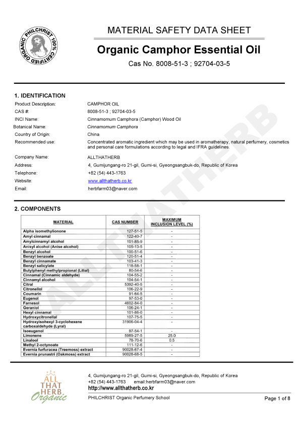 Botanical Name: Cinnamomum camphora Note: Middle to Base Note Part of the Plant: Wood Country of Origin: China Extraction Method: Steam Distilled Aromas: Sharp, penetrating, camphoraceous, and medicinal scent