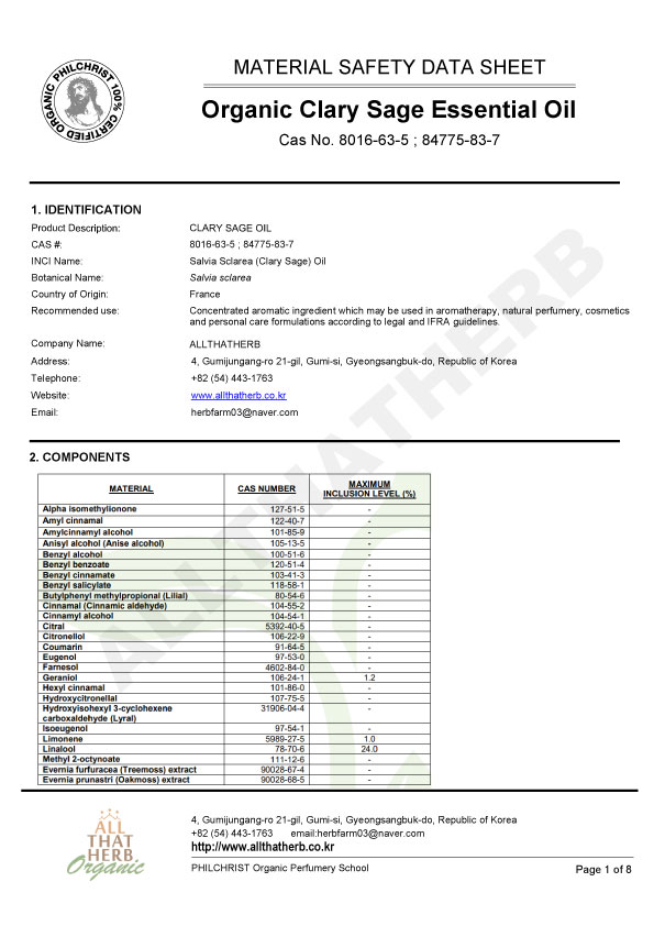 Botanical Name: Salvia sclarea Note: Middle Note Part of the Plant: Flowering Tops and Leaves Country of Origin: France Extraction Method: Steam Distilled Aromas: Leathery and amber nuances