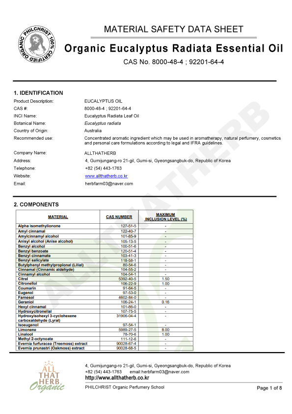 Botanical Name: Eucalyptus radiata Note: Top Note Part of the Plant: Leaves Country of Origin: Australia Extraction Method: Steam Distilled Aromas: Fresh, clean, minty, and camphorous